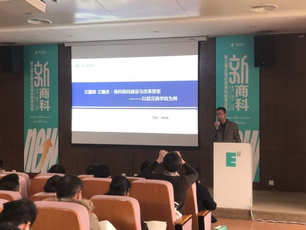 陈文武经理以“三服务、三融合:商科院校建设与改革探索”为主题作了报告。报告从“以本为本—树立本科教育中心地位,以商为核—强化优势学科专业建设,以教为基—创新应用型人才培养模式,以融为径—深化政行企校、产学研协同育人,以质为根—创新教学质量保障体系”五个方面介绍了商科院校建设与改革举措,提出了难点与盲点。