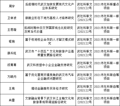 2021年武汉市社科联项目立项通知已经发布,我院获批4项。立项文(见附件1)请各项目负责人及主要参与成员自行下载留存。
